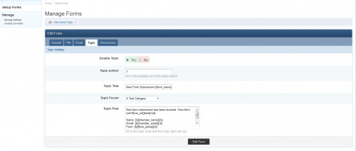 Optional confirmation email to let members know there message was received. Per form option to add attachments. Including options based at member group level. Send reply emails within the Form Manager Quick preview feature for form logs. Per form option for rules or instructions for each form. Submit time wait feature, set how long each member group must wait before resubmitting a form. Per form permissions for who can view and submit to a form. And also who can view any form logs. Per member group option to bypass captcha. Per form option to send out personal messages when new form submissions are made. Per form option to send out emails when new form submissions are made. Per form option to create a forum topic when new form submissions are made. Custom Fields: