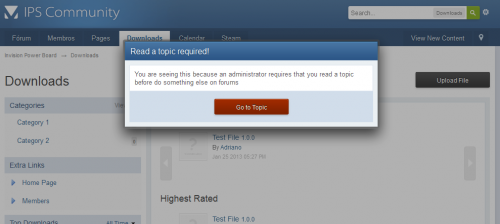 This application will force members in selected groups to read a specific topic/forum nnouncement before being able to use the site. A popup will appear to those users with only one option: a button to redirect to that topic.
