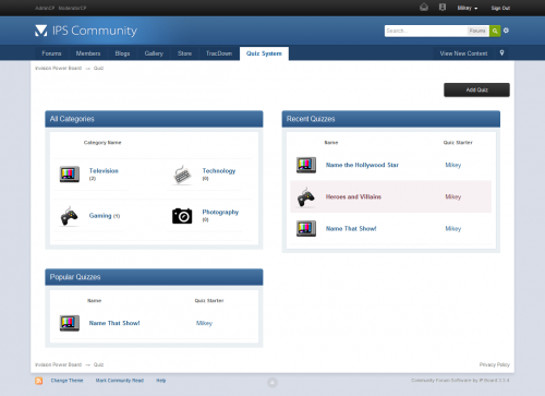Quiz System is a fun application which allows you and your members to add Quizzes to your forum. With leaderboards, categories and a unique layout, The Quiz System is sure to be a hit with your members.