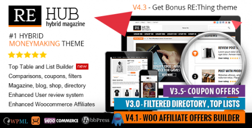 REHub – Hybrid wordpress template with enhanced affiliate, coupon, directory functions + ECWID + WOOCOMMERCE + EasyDigitalDownload + BBPress + Affiliate links builder support