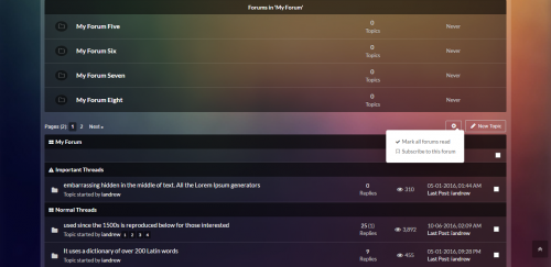 It relies almost 100% on Bootstrap 3 with minimum overrides and it’s 99% tables. If you are familiar with Bootstrap 3 it’ll be like fun dealing with this MyBB theme.