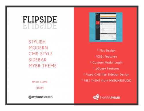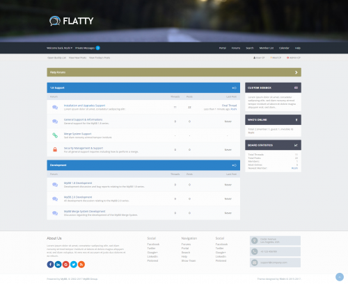 Sidebar/Full width. Font Awesome icons. Supported MyBB Plugins. Very original and unique Dark Flat Forum look. Beautiful, professional Header and Footer. Customized for both classic and Modern Postbit. Social Share included. Custom, beautiful Editor. Extensive Documentation. One of the best Responsive/Mobile look among MyBB Themes.