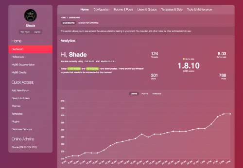 Whisper is a neat theme for the Admin Control Panel. The theme includes some extra features other than the design itself, aimed to improve the ACP usability, including a new homepage with stunning analytics and more friendly information about your server and your MyBB installation, full page template editing, more understandable and centered popups and messages, comprehensive selectors and radio buttons.