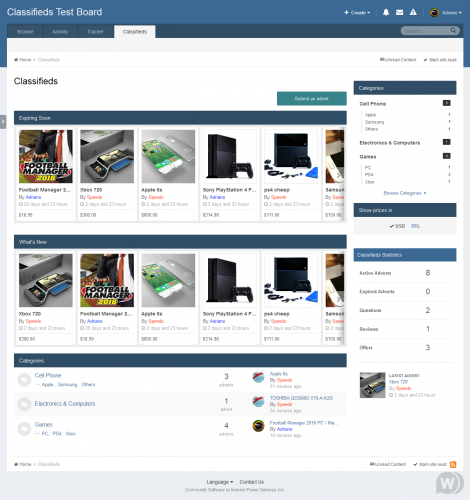 The Classifieds System is an IPS 4 announcement system, an application that allows your users to post products for sale. The administrator can enable transactions that allow participants to buy items directly from another participant through the application, and the advertiser receives the amount paid by credit card. If OPERATIONS are disabled, everything must be done manually: the participant must contact the advertiser the way he wants (he chooses when publishing the advertisement), make a deal, after which the advertiser sets the flag as SEND. After the payment / transaction is completed, the advertiser sets the ad flag as COMPLETED.