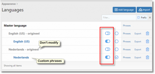 Now, you can disable 'Nederlands - origineel' (that's why you installed the add-on). This prevents users from selecting this language. They will only see your customized version called 'Nederlands'
