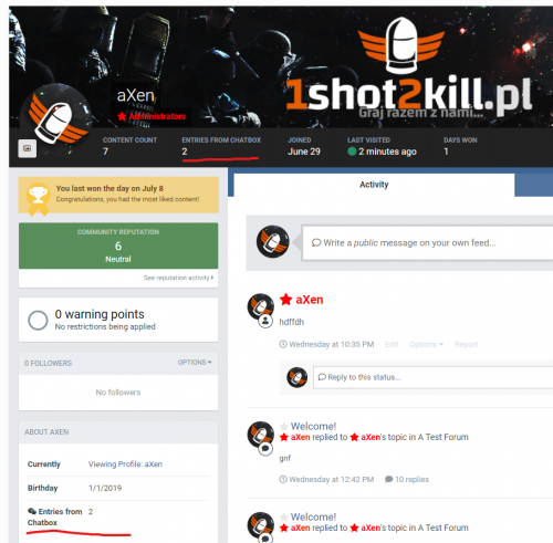 Hovercard - Podgląd profilu, Profile - Profil, ProfileHeader - Header profilu, Topics - Tematach Wymagana jest aplikacja (BIM) Chatbox FREE w dowolnej wersji.