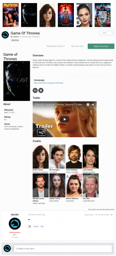 Users can add movies, series, anime and actors to topics. After attaching the content, which can be done easily using a search with auto complete, the thread will show various information about the chosen content above the post. The topic will show the movie poster, cast, trailer, tagline, link to IMDb, rating and much more. Discussed movies and actors can be shown in adjustable widgets which allow random, recently posted, most discussed and much more... Posting content can be restricted to certain forums. Movie boards can show movie content with the posters above the topic list. Access rights to edit and post content.
