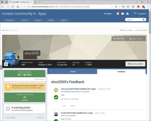 Members can leave positive, negative, or neutral feedback Optional or mandatory link in feedback to the content item Ability to link Feedback against most content items (including 3rd party, for example Classifieds) Integrates with Invision Community's notification system Integrates feedback information in member profiles Restrict access and features based on member group Captcha on Feedback Submission Flood Control on Feedback Submission148 downloads