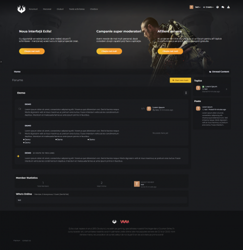 <div id='ipsLayout_header'> <header> <div class="ipsContentBox"> <div class="ipsLayout_container"> <div class="ipsLogo"> <a href="https://ecila.ro/forum/"><img src="https://i.imgur.com/24q7g3D.png"></a> </div> <div class="meniuforum"> <a href="https://ecila.ro/forum">Forumuri</a> <a href="https://ecila.ro/forum/index.php?/staff/">Personal</a> <a href="https://ecila.ro/forum/index.php?/clubs/">Cluburi</a> <a href="https://www.Ecila.ro/forum/index.php?/discover/">Toată activitatea</a> <a href="https://www.Ecila.ro/forum/index.php?/bimchatbox/">Chatbox</a> </div> <div style="float: right" class="ipsUserPanel"> {{if !\in_array('ipsLayout_minimal', \IPS\Output::i()->bodyClasses )}}{template="userBar" app="core" group="global" params=""}{{endif}} </div> </div></div> </header> </div> <div class="header_slider"> <div class="ipsLayout_container"> <div class="swiper-container"> <!-- Additional required wrapper --> <div class="swiper-wrapper"> <!-- Slides --> <div class="swiper-slide"> <div class="header_slider-content"> <h2 class="header_slider-title">Noua interfață Ecila!</h2> <p class="header_slider-subtitle">Cu siguranță vor exista lucruri care credeți că pot fi schimbate - menționați acest lucru în topicul special creat.</p> <a href="https://ecila.ro/forum/index.php?/topic/1457-noua-interfa%C8%9B%C4%83-ecila" class="header_slider-btn header_slider-btn--orange">Citește mai mult</a> </div> </div> <div class="swiper-slide"> <div class="header_slider-content"> <h2 class="header_slider-title">Campanie super moderatori</h2> <p class="header_slider-subtitle">Avem nevoie de mai mult personal, dacă consideri că ești capabil poți face o aplicație.</p> <a href="https://ecila.ro/forum/index.php?/topic/1401-campanie-super-moderatori" class="header_slider-btn header_slider-btn--orange">Citește mai mult</a> </div></div> <div class="swiper-slide"><div class="header_slider-content"> <h2 class="header_slider-title">Afiliere servere</h2> <p class="header_slider-subtitle">Ai un server de CS1.6 sau GO și nu ai un forum pentru el? Aplică în comunitate și vei primi DNS și categorii gratuite.</p> <a href="https://ecila.ro/forum/index.php?/forum/19-cerere-afiliere" class="header_slider-btn header_slider-btn--orange">Citește mai mult</a> </div></div> </div> <!-- If we need pagination --> </div></div> </div> To edit the footer text, go in „footer” and search for these lines !