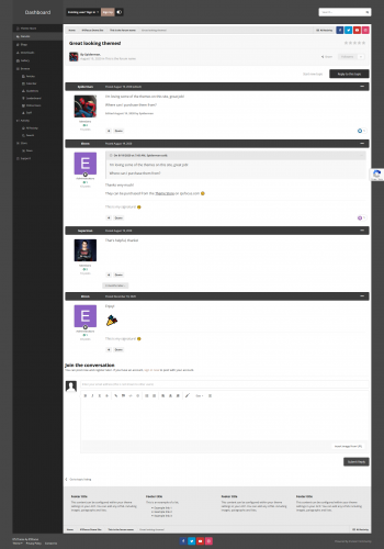 Dreadnought is modern, Creative, Super advanced theme comes with tons of customization's and features including responsive drop down navigation, Google fonts, custom html full-sized widgets, Advanced footer, Social links, News ticker, Custom forum category styles, Six of awesome article templates and a powerful touch slider that can be integrated with (IP.Content) as a complete package for infinite slider, theme colors are entirely customizable with easy settings, You can manually change ALL colors and switch between a Dark or White scheme with color settings. Dreadnought theme is beautifully responsive and mobile friendly, it is best suitable for Gaming website, Included with Dozen of useful settings and features for example adding a fixed social link on sidebar or footer, also two custom widgets to show on top or bottom of your website you can place it anywhere you want for example Registration page, Login page, Staff directory page, Search page, User profiles page...etc) You can also set user group permissions for each of the widgets.
