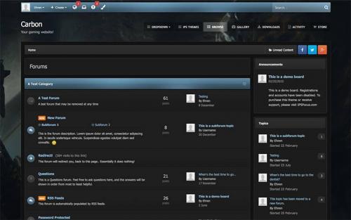 Carbon, named after the carbon texture which is used throughout the design, is a dark theme for IPS.Suite 4.x and is especially perfect for gaming sites. The blue color scheme can be modified easily with a few simple clicks in your ACP theme settings, and your members can customize the theme themselves by choosing their own background image from a preset array.