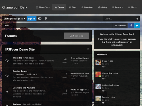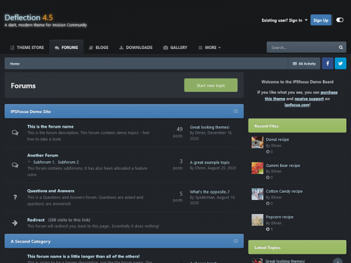 Deflection is a clean, dark IPS theme with a soothing colour scheme. The header can be configured with background images if preferred, which can be controlled even further with the background picker enabled. This theme is built on a modern framework with minimal HTML modifications, which means it'll upgrade easily (and usually automatically) between IPS versions.