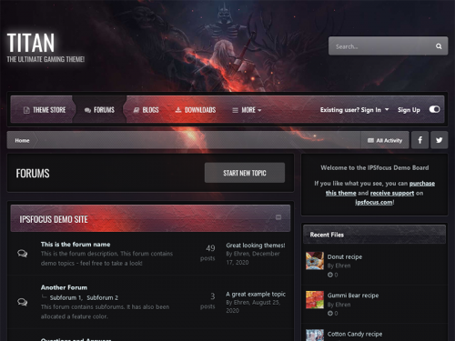 Titan is the ultimate gaming theme, based upon a large wallpaper image which is blurred behind textured navigation and category bars. Easily upload your own image via the theme settings to completely change the colour scheme, or let your members choose from a predefined selection!