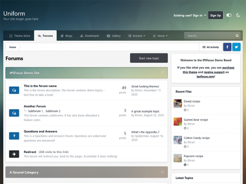 Uniform is a light, modern theme focused around a background picker which applies a single background image throughout the entire forum, including category bars and forum icons. The theme is packed with customizable features which can be easily enabled or disabled from within the Admin Control Panel.