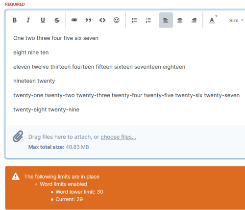 impose limits on the number of words or characters that the editor's content must contain before the content can be submitted in addition, the number of links/videos/emojis/spoilers/images can also be monitored settings can be imposed on a group basis, meaning that one group can have different limits from others, or have no limits at all settings are then imposed on an app basis (Forums/Calendar/Pages) and can target all or some of the elements within those apps Please note the following: