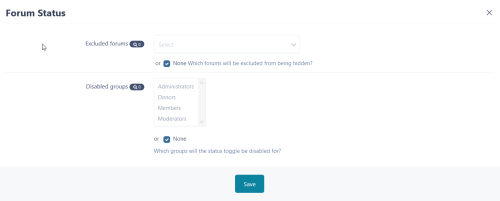 Set "active" or "inactive" values for each forum. Forum homepage toggle between "active", "inactive" or "both" statuses. Set which forums are excluded and shown at all times regardless of the status selected. Set which member groups are disabled from viewing different states.3 downloads