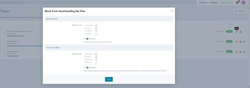 This will add another tab in the user's settings panel allowing them to choose members and block their chosen members from downloading their files If you have IP Commerce installed and paid files in the downloads it will also block them from buying their files Members can also select certain user groups to block from downloading their files with the ability to exclude x/y/z member/s from that group giving them permission to download Pick what user groups can use the features in the plugin settings Requirements