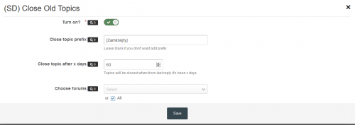 Plugin searches for topics in selected forums that have a last post date that is older than X days and closes them. In addition we can set up topic prefix.