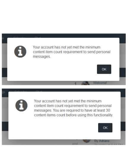 This plugin will set a number of Content Items that users must have to send new PMs. You can set the required number of Content Items, including if you would like to display this number in the message, and which user groups will be affected.