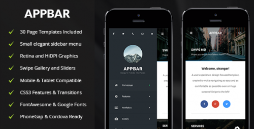 Combining the beautiful features of a native mobile application with a beautifully designed and elegant experience. Simple to use with a swap to enable drawer menu, packed with 30 page templates and more than 100 specific features. AppBar is the last mobile template you will ever have to download.