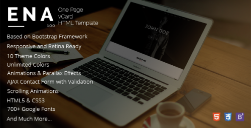 ENA is a unique one page vCard HTML Template destined for personal and professional use. You can use it for your personal resume, CV or even your creative portfolio. It has a clean and modern design to make it stand out. Being developed on Bootstrap Framework 3 makes it responsive in order to have the best view possible on mobile devices. ENA comes with 10 pre-defined colors which are easily customizable and makes it easy to create new colors.