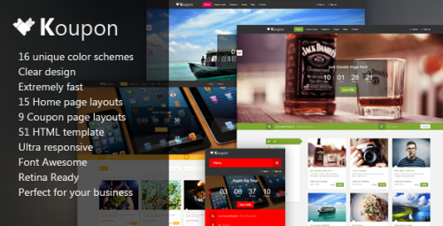 [b]Kupon[/b] – is creative template for coupon selling websites. Unique and simple. Ultra responsive with user friendly responsive navigation. With huge amount of features you can make it as unique as you want. Main features[list]