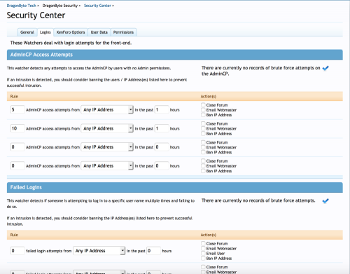 DragonByte Security is the ideal product for forums that are concerned about security, or wish to be alerted when something suspicious happens. Featuring multiple "Security Watchers" such as Failed Logins and Failed AdminCP Logins, you can set up different "tiers" of actions to be taken when certain thresholds are met. For example, if someone tries to log in to 5 different accounts from the same IP address in 1 hour, you can alert the webmaster. If they try 15 accounts in 1 hour, ban the IP address from your forum entirely.
