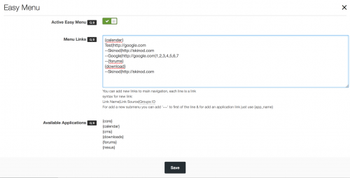 Easy Menu is a IPS4 plugin which let you modify main navigation easily. it supports external links as well as internal links.