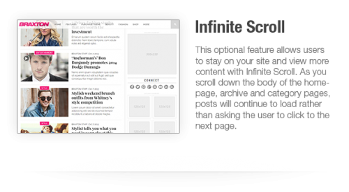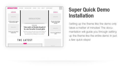 Braxton is the premier magazine theme that combines both form and function into one comprehensive Wordpress theme. This sleek, modern theme is retina-ready, fully-responsive and comes with four different ad units, including a custom wallpaper ad. Braxton is also compatible with WooCommerce and BBPress, is translation-ready, fully-responsive, comes with over 600 Google Fonts, a Featured Slider on each category page, Infinite Scrolling, Lazy Load, a “sticky” menu bar and sidebar, post/page slideshows, super quick demo install and so much more!
