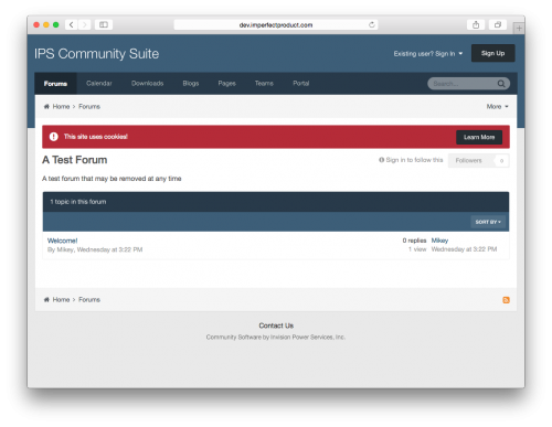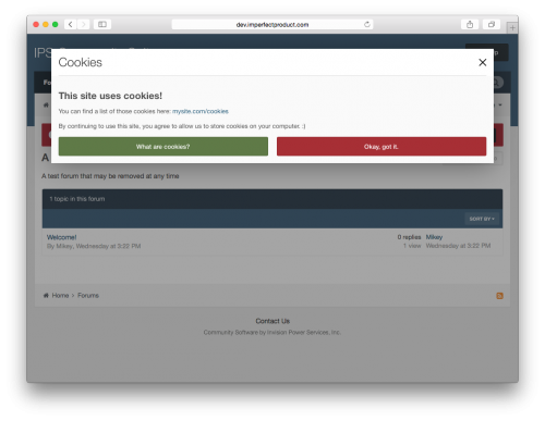 This plugin adds a bar at the top of an IPS4 Suite which informs the user that the site uses cookies and offers more information in the way of a pop up.