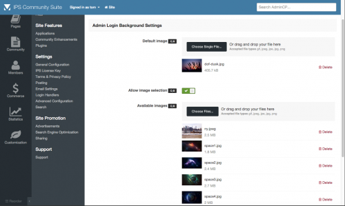 Admin Login Background by IPS Themes adds the ability to select your own background image on the IPS Suite 4.0 administrator login page. Set a default image for all visitors of the login page or allow visitors to select from a series of images. Selections are saved in a cookie so all future visits will show the selected background.