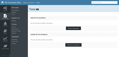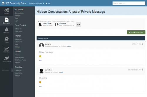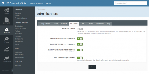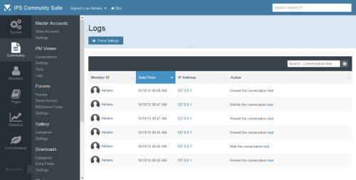 This application will allow administrators to read conversations on Admin CP. If admins has a special permission, they will also be able to VIEW hidden conversations, EDIT, HIDE/UNHIDE conversations (from appearing on PM Viewer application) and INVITE/REMOVE MEMBERS from conversations. Conversations can also be tracked by filtering keywords. If a specific keyword added by an admin is used on Conversation, users from selected group will receive a notification with a link to the conversation on PM Viewer application. Admins can also use tools to HIDE or UNHIDE all conversations with one click.