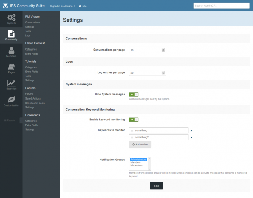 - Notification Groups: Members from selected groups will be notified when someone sends a private message that contaims a monitored keyword.