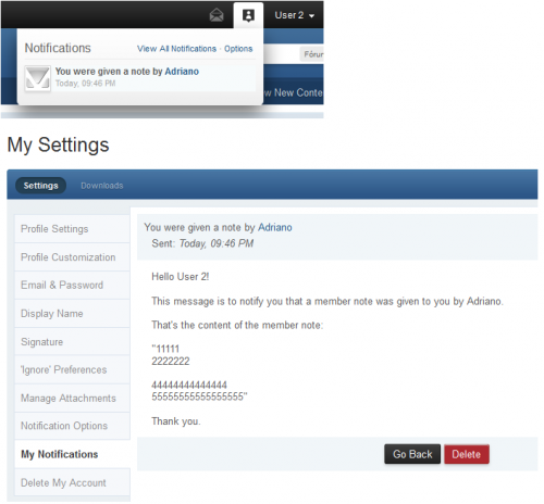 This hook will allow moderating team to add notes (plain text) to members. A notification will be sent to all users from selected groups (moderating team) when a member receives a new note.