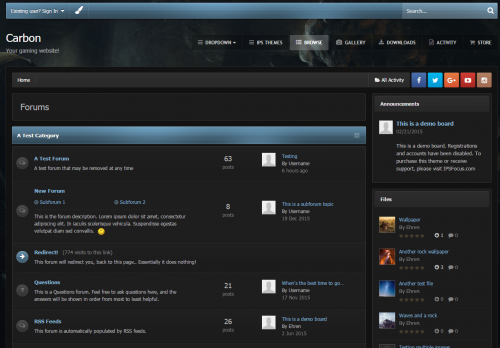 Carbon, named after the carbon texture which is used throughout the design, is a dark theme for IPS.Suite 4.x and is especially perfect for gaming sites. The blue color scheme can be modified easily with a few simple clicks in your ACP theme settings, and your members can customize the theme themselves by choosing their own background image from a preset array!