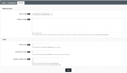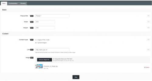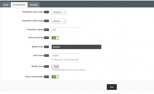 • Transition open/close: FadeIn/FadeOut, SlideIn, SlideUp, SlideDown, SlideBack.