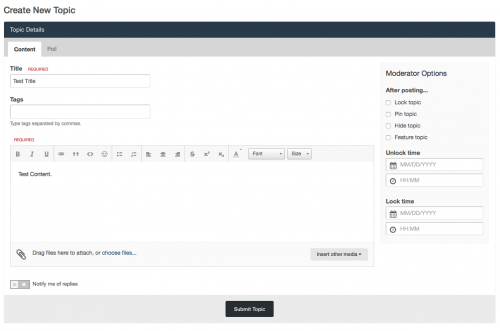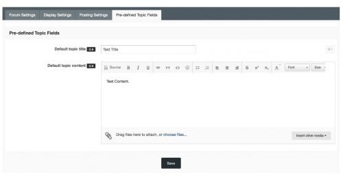 Lets you set up some default text that will be filled in for all new topics in specified forums. You can define the default Topic Title and initial post content. People posting new topics in forums where this is active will be able to alter this text, but it is useful to provide a common template for specific types of topics.