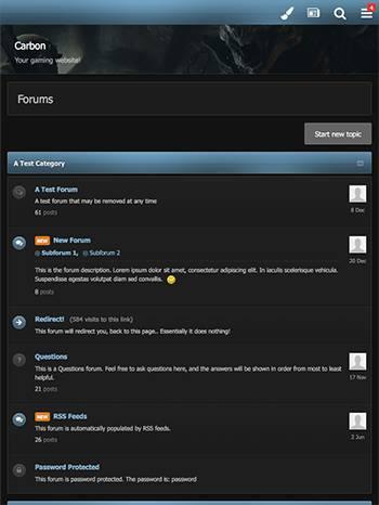 Carbon, named after the carbon texture which is used throughout the design, is a dark theme for IPS.Suite 4.2 and is especially perfect for gaming sites. The blue color scheme can be modified easily with a few simple clicks in your ACP theme settings, and your members can customize the theme themselves by choosing their own background image from a preset array!