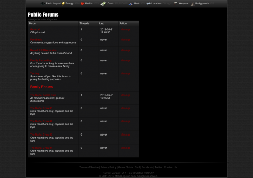 - Forums – Custom built forum integrated with the game. Administrators can edit and add new forums, lock, sticky, delete, edit topics/posts, anyone can post in the forums. There are even forums automatically created only for each family with each family forum with its unique family permissions.