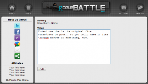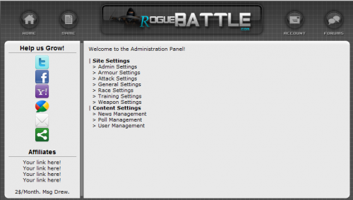 We’ve also created a fully functional built in admin panel. When you log in you’ve got the option in the main home bar to go to the admin panel. From there, you can edit the names of the races and the names of the weapons and defense items as well. So if you don’t want a old type rpg game feel, you can change it up to make it a army game or something instead! You can also manage news, polls, users, nearly everything! You won’t have to edit php files 24/7 or go into your sql database, you can simply do most of the work from the admin panel. We’ve also got staff ranks all setup. So you can hire moderators and any type of staff you wish right away. They’ll only get certain limited access to the admin panel though. I’m sure you get the idea!