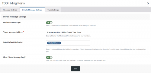 - Select Default Moderator: Use this option to use a Dummy Moderator for Hiding Content. The real Moderator Name will be obfuscated from the Member. This is used in the Private Message only.