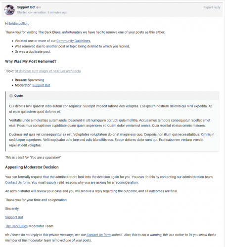 Administrators can optionally have a customable Private Message send to the member of the Hidden content, explaining the reason why their content was hidden. Private Messages can be set as no-reply to give hot-head members time to cool down ![]()