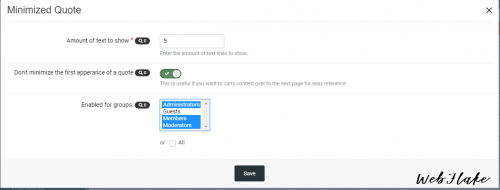 - New setting: You can choose to NOT minimize the first appearance of a quote. If the original post is not on the same page, and it's the first time the post is quoted on a new page, the quote box will not be minimized. Useful if you have a forum where your members "carry stuff over" to the next page by quoting the post.