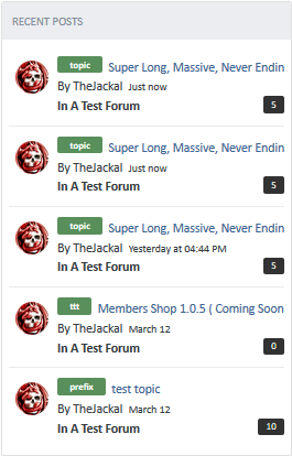 Features nice new design instead of the default IPS widgets, Shows the prefix of the topics if one is set with a nice coloured box around the prefix, Select what forums to show the results from, Select the limit of results to show on each widget, You can also pick the topic prefix colours on each widget, This currently has 9 widgets but more will be coming ( Let me know what sort of ones you would like )