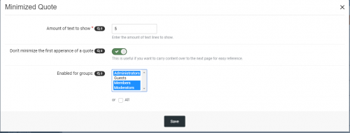 - New setting: You can choose to NOT minimize the first appearance of a quote. If the original post is not on the same page, and it's the first time the post is quoted on a new page, the quote box will not be minimized. Useful if you have a forum where your members "carry stuff over" to the next page by quoting the post.