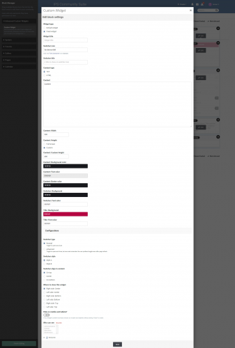 Comes with a lot of configurations to customize, Fixed widgets can have a specific width and height or full screen height, Set a position to show the widget, Optionally hide on mobiles and tablets, Change colors, Choose who can see...etc)