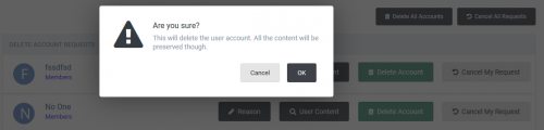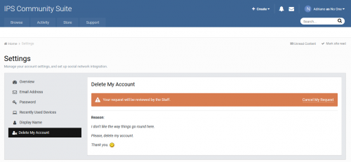 This application will allow users from specific user groups to request to delete their account. All requests will be reviewed by Staff (admins), directly on ModeratorCP -> Delete Account Requests, to approve or deny the request. The whole user content (topics, posts, attachments, polls, etc.) will be preserved; only the account will be deleted.