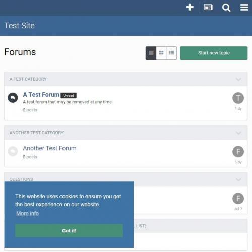 This plugin displays a cookie notice message popup. In the ACP you can set the message and specify an URL to read more about your cookies policy. You can also choose different positions and styles for the popup, as well as customize the colors. Clicking the "Got it!" button sets a cookie to no longer show the message.