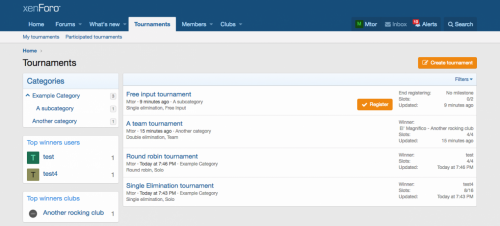 With Tournament, you and/or your users can create and manage (invite users, kick users, ...) public or private tournaments with up to 64 contestants in just a few mouse clicks among 6 different types: Single elimination, Single elimination with consolation bracket, Double elimination, Round Robin, Round Robin with 2 way matches or manual winner nomination.