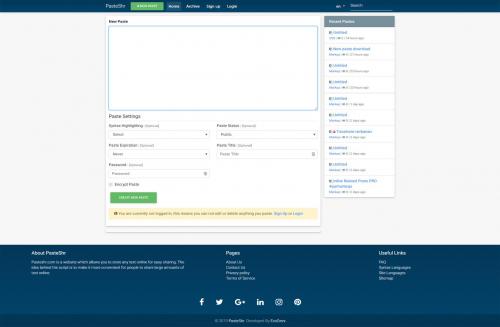 - Password protected pastes - Encrypted pastes - Improved UI for small devices. - Removed 'paste' from paste url. - Added settings to enable/disable features (share, copy link, raw, download, embed, report, print) in admin - My Recent Pastes box for logged in users - Added Image logo and settings - Added Favicon and settings - Added open graph tags - Improved settings in admin - User create from admin bug fixed